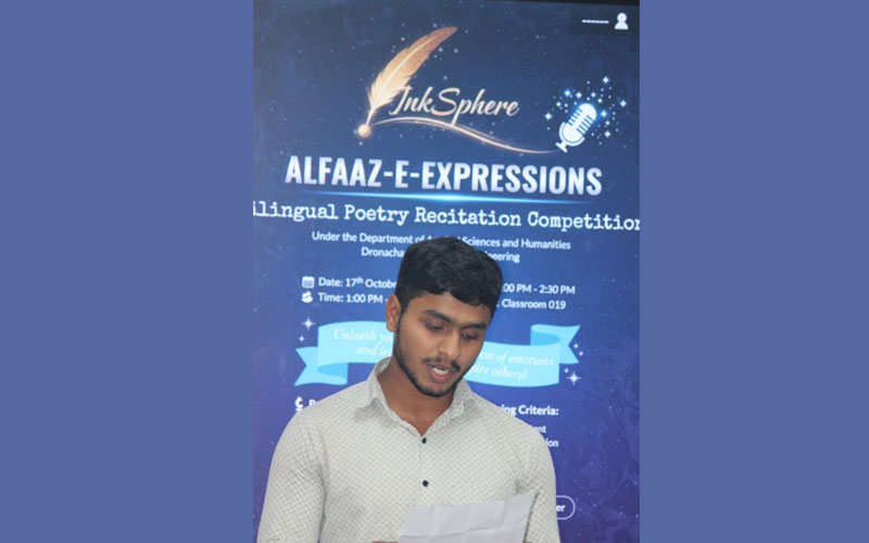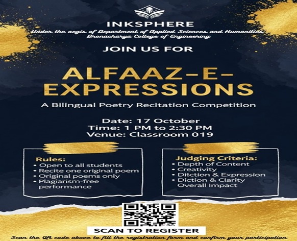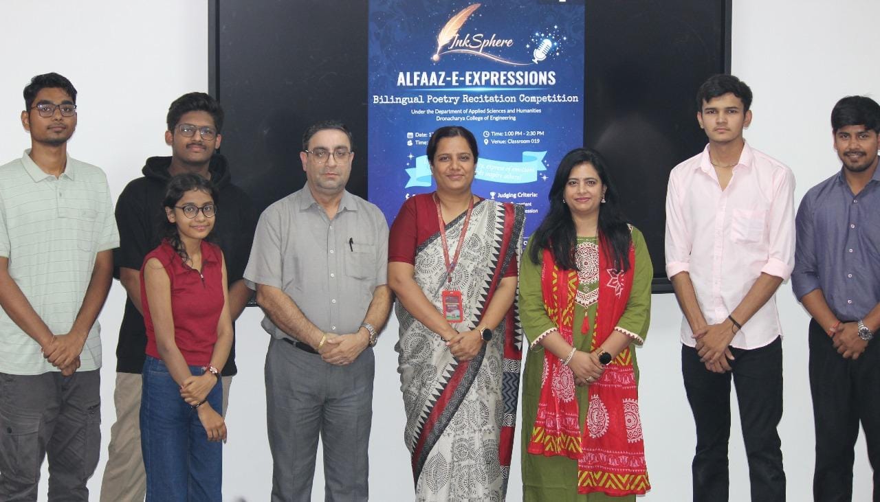 Ink Sphere - The Literary Club of Dronacharya College of Engineering, under the aegis of Department of Applied Sciences and Humanities, successfully organized Alfaaz-e-Expressions on 17th October 2025, a bilingual poetry recitation competition designed to celebrate creativity, linguistic expression, and the art of poetic performance. The competition invited students to present their original poems in English or Hindi, emphasizing authenticity, creativity, and emotional depth. By offering a vibrant platform for budding writers, the event encouraged students to express their thoughts through the rhythmic and expressive power of words.