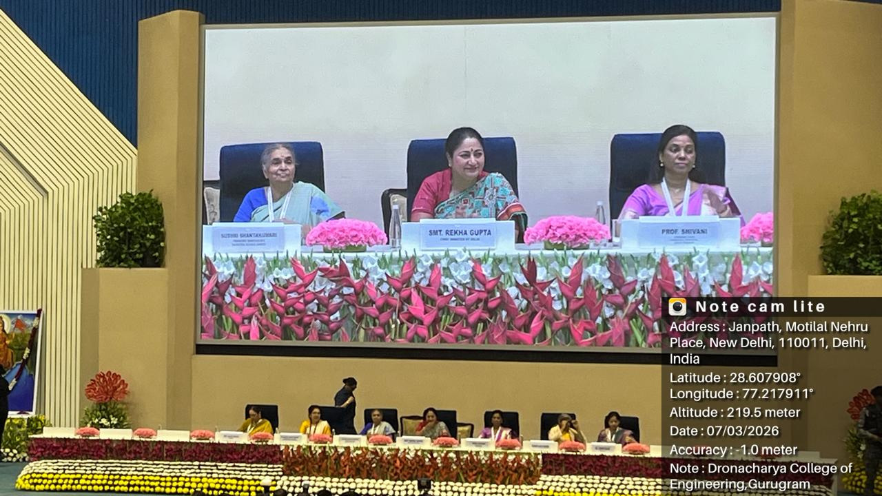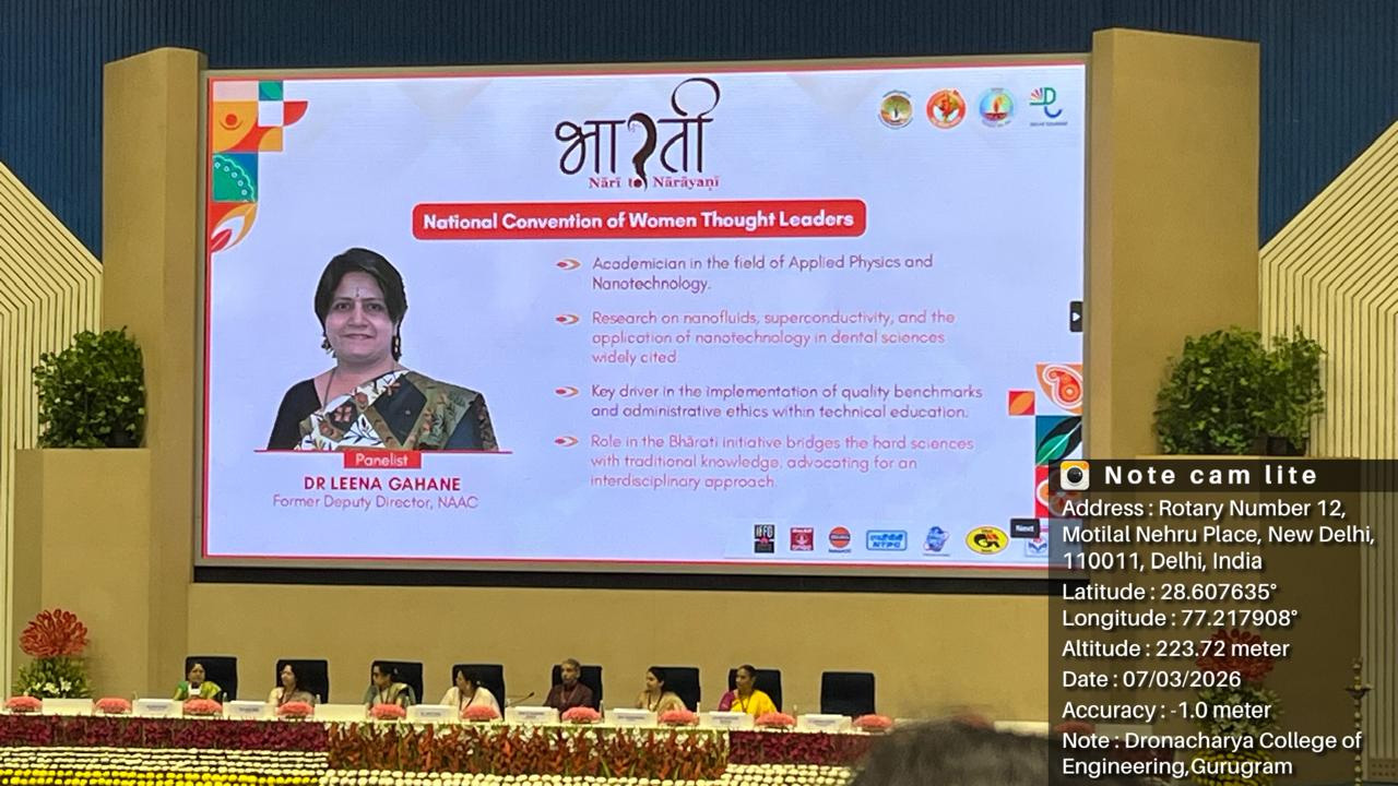 Dr. Vaishali Dixit (Associate Professor, APS) faculty at Dronacharya College of Engineering, Gurugram, attended the “Bharati – Nari to Narayani: National Convention of Women Thought Leaders”, held at Vigyan Bhavan, New Delhi, on 7th–8thMarch 2026, onthe occasion ofInternational Women’s Day. The convention focused on women’s empowerment, highlighting the transformation of “Nari” (woman as silent strength) into “Narayani” (a strategic and powerful force). Rooted in Indian philosophical thought, the event emphasized the pivotal role of women in leadership, social transformation, and nation-building.