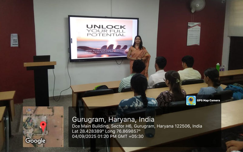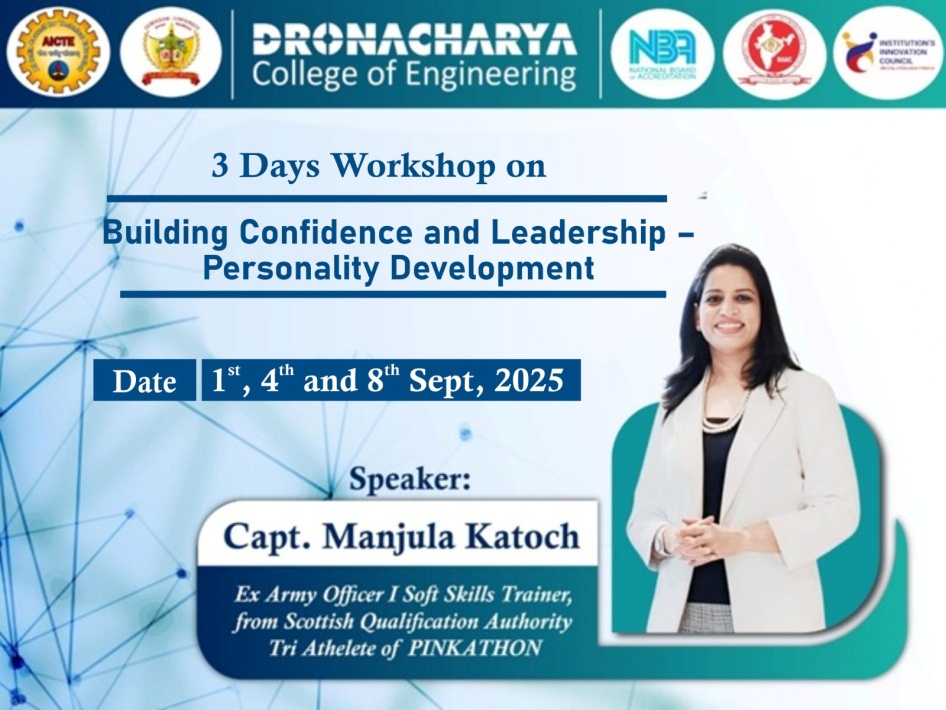 Dronacharya College of Engineering, Gurugram conducted a three-day Personality Development Workshop on 1st, 4th, and 8th September 2025, facilitated by Captain Manjula Katoch, an Ex-Army Officer and Soft Skills Trainer certified by the Scottish Qualification Authority. The workshop was thoughtfully designed to help first-year B.Tech students adapt confidently to college life while developing essential interpersonal and professional competencies. Through interactive and experiential activities, Captain Katoch motivated students to recognize their strengths, work on self-improvement, and build confidence, collaboration, and communication skills.