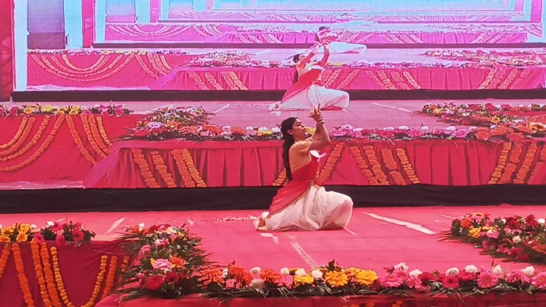 The festivities commenced at 9:30 AM with a cheerful welcome of the freshers near the stage area. Dressed in colorful ethnic attire reflecting the Desi Swag theme, the students filled the campus with smiles, laughter, and excitement. The dignitaries, including the Hon’ble Chairman Dr. Satish Yadav and Ms. Kailash Yadav (Chief Guest), Director, Principal, Registrar, HODs, and faculty members, graced the occasion at 10:00 AM. The programme began with the lighting of the ceremonial lamp accompanied by Saraswati Vandana, symbolizing wisdom and positivity.