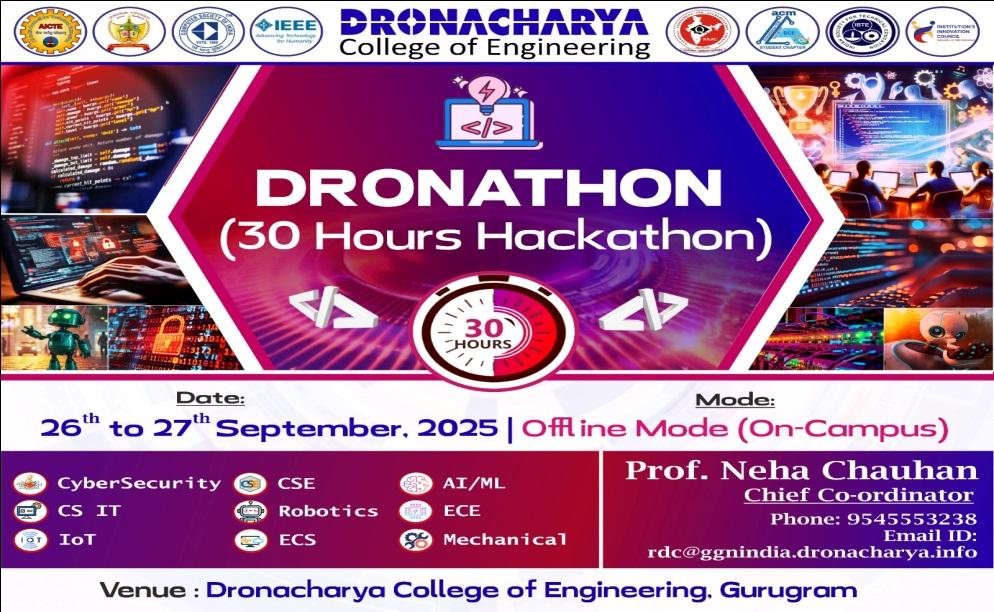 RDC, Dronacharya College of Engineering, Gurugram organized a 30-hour Internal Hackathon on 26th and 27th September 2025 as a preparatory initiative for the Smart India Hackathon (SIH) 2025. The event provided a dynamic platform for students to showcase innovation, creativity, and technical expertise across various domains. A total of 34 teams, comprising 102 students along with Faculty Coordinators- Prof. (Dr.) Isha Malhotra (Principal), Prof. Neha Chauhan (RDC), Dr. Ashima Mehta (HOD CSE), Dr. Ritu Pahwa (HOD AIML), Dr. Megha Goel (HOD CSIT/IOT/ECS), Dr. Dimple Saproo (HOD ECE/EEE), Prof. Pooja Sharma (HOD Applied), and all departmental RDC coordinators, participated enthusiastically, demonstrating their passion for problem-solving and collaboration.