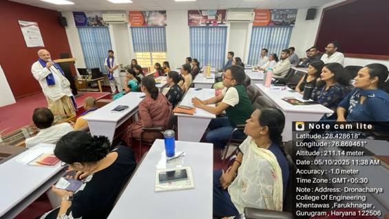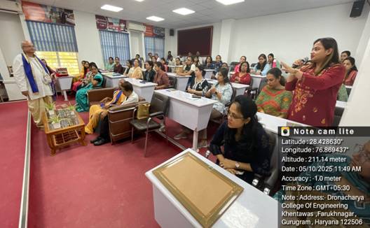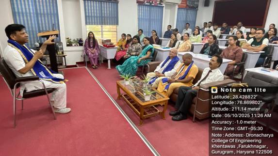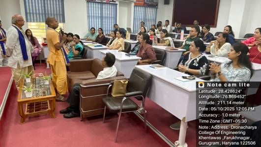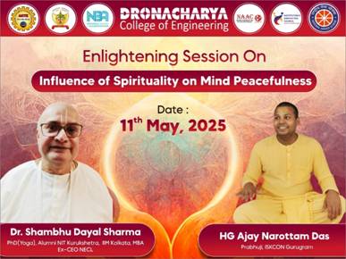 Yog Club, Dronacharya College of Engineering, Khentawas, Farrukhnagar, Gurugram, hosted an inspiring session on the “Influence of Spirituality on Mind Peacefulness” on 11th May 2025. The event, graced by Dr. B.M.K. Prasad, Director, and Dr. Isha Malhotra, Principal, highlighted the institution’s vision of nurturing holistic well-being alongside academic growth. Their encouraging presence set the tone for a thought-provoking dialogue on how spirituality can be a guiding light in today’s fast-paced world.