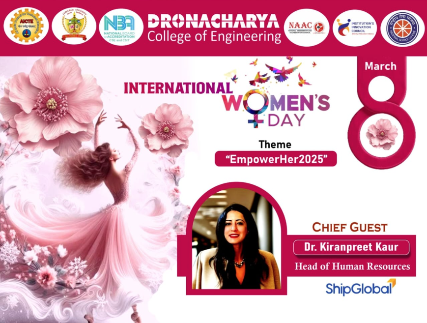 Cultural Club of Dronacharya College of Engineering organized a vibrant and meaningful celebration of International Women’s Day on 8th March 2025, centered on the theme “Empower Her 2025.” The program began with a warm welcome of the Chief Guest, Dr. Kiranpreet Kaur, Head of Human Resources at Ship Global, by Prof. Isha Malhotra, (Principal). In her welcome address, Prof. IshaMalhotra highlighted the importance of women’s leadership, empowerment through education, and the institution’s commitment to nurturing confident and capable individuals.