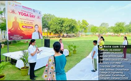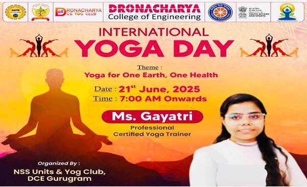 NSS Units of Dronacharya College of Engineering, Gurugram, actively celebrated the International Day of Yoga on 21st June 2025 with an inspiring and energizing session on campus. The event, organized jointly by the NSS Units and the Yog Club, witnessed enthusiastic participation from students, faculty, and staff, all embracing the theme “Yoga for One Earth, One Health.” The session was led by professional and certified Yoga Trainer Ms. Gayatri, whose expertise and engaging approach made the experience both enjoyable and enlightening.
