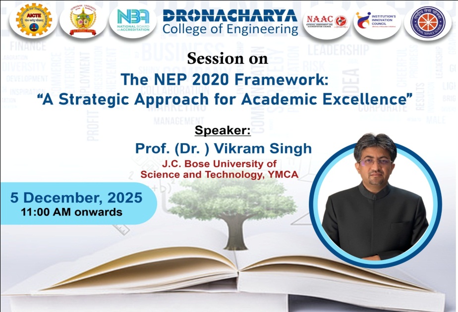 Dronacharya College of Engineering, Gurugram organized a Technical Session on “The NEP 2020 Framework: A Strategic Approach for Academic Excellence” on 5th December 2025 for all faculty members. The session was delivered by Prof. (Dr.) Vikram Singh from J.C. Bose University of Science and Technology, YMCA. The objective was to equip faculty with a comprehensive understanding of the National Education Policy (NEP) 2020 and its strategic significance in enhancing academic quality.
