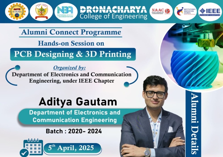 Electronics and Communication Engineering Department and IEEE Student Chapter organized a workshop on PCB Designing and 3D Printing; two of the most in-demand technical skills in the electronics and embedded systems industry on 5th April 2025. The workshop was led by Er. Aditya Gautam, a respected alumnus known for his work in the field of electronics design. 60 students from Electronics and Communication Engineering (ECE), Electrical and Electronics Engineering (EEE), and Electronics and Computer Science (ECS) departments actively participated in the hands-on-session, highlighting the interdisciplinary appeal of the event. Dr. Neha Mathur was the faculty coordinator.