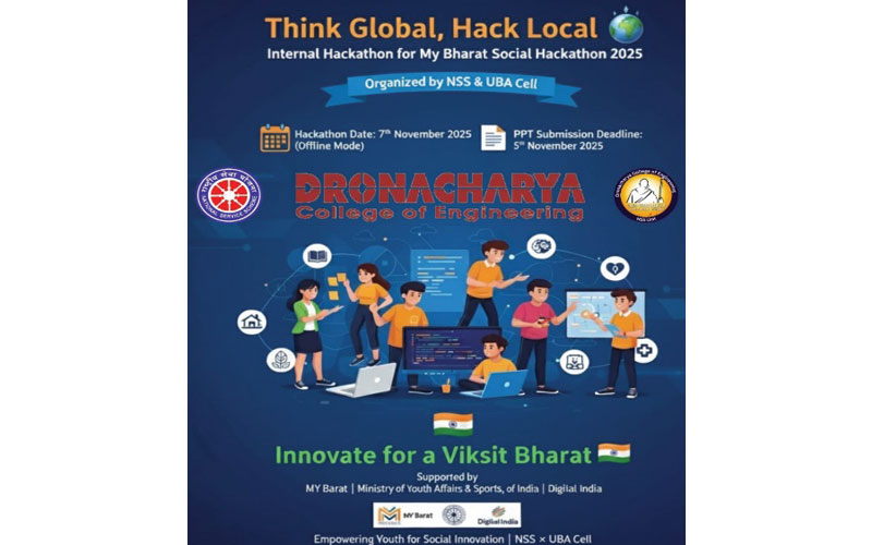 NSS Units, Dronacharya College of Engineering (DCE), Gurugram, successfully organized the Institutional Hackathon under My Bharat Social Hackathon 2025 initiative, on 7thNovember 2025aligned with the VBYLD 2026 (Viksit Bharat Youth Led Development) program initiated by the Ministry of Youth Affairs & Sports, Government of India. The hackathon, titled “Hack for Social Cause,” aimed to empower youth between 18-29 years to develop scalable, technology-driven solutions for social good.