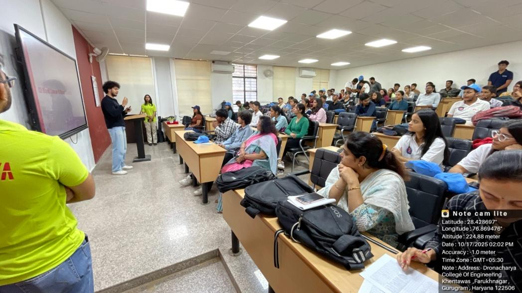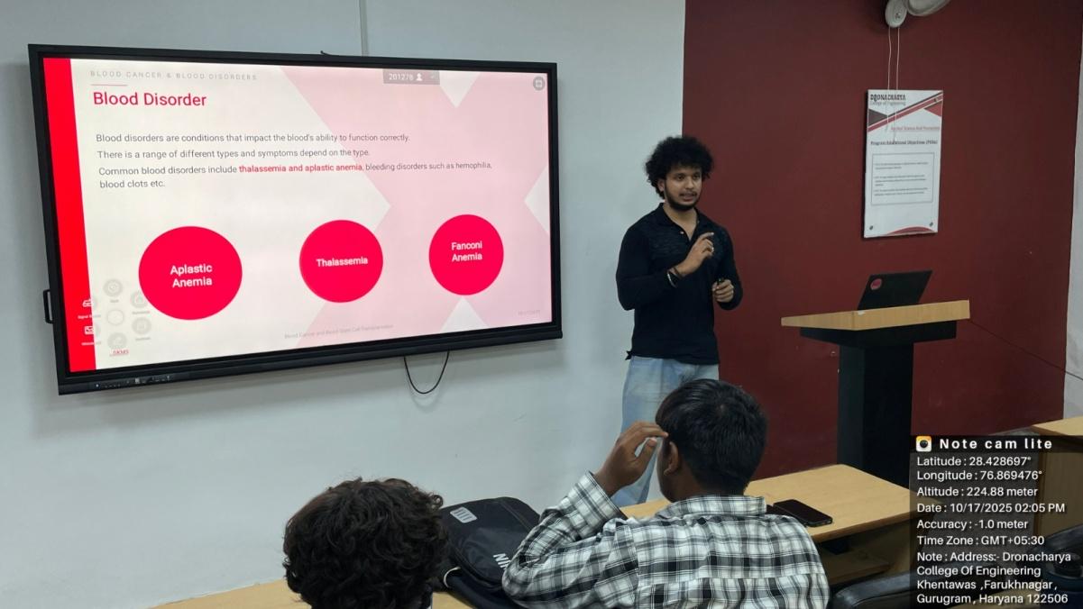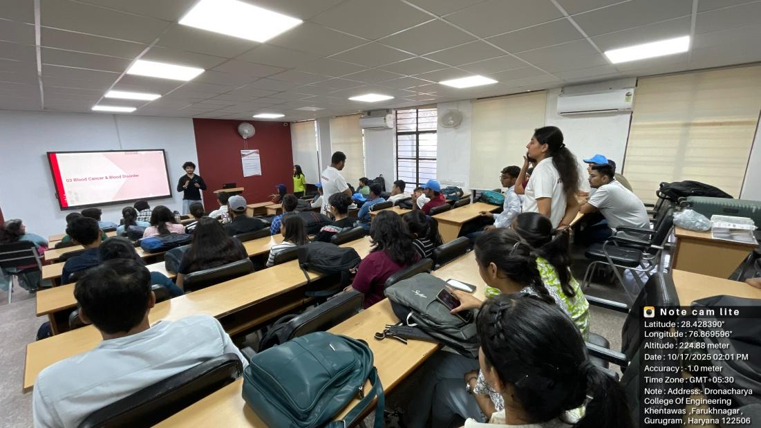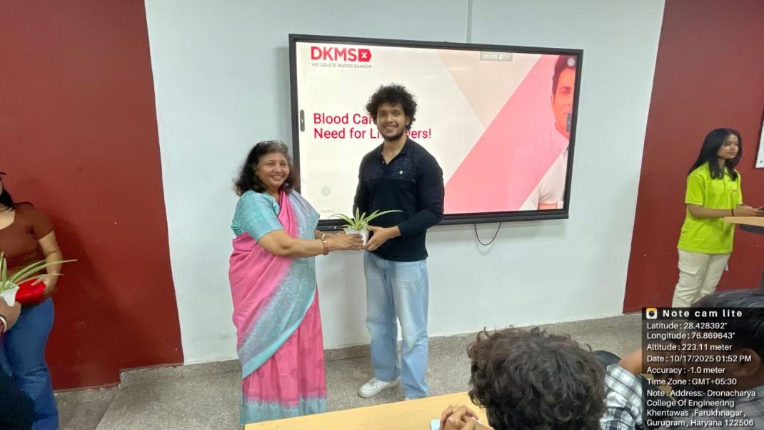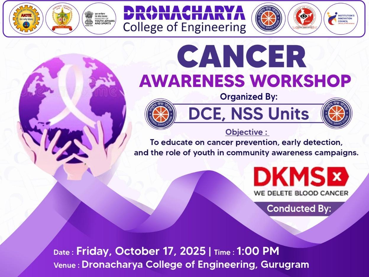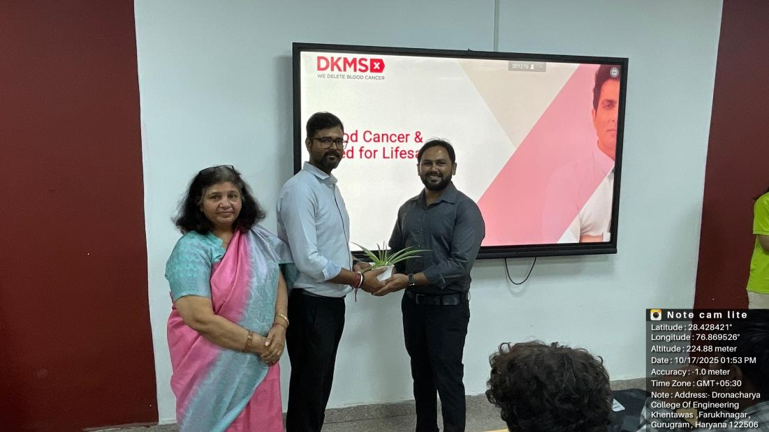 NSS Units of Dronacharya College of Engineering (DCE), Gurugram, in collaboration with DKMS Foundation India, successfully organized a Cancer Awareness and Blood Stem Cell Donor Registration Drive on 17th October 2025, at the DCE campus. Mr. Rahul Raj from DKMS Foundation of India was the spoke person. DKMS Foundation India is a globally recognized non-profit organization dedicated to combating blood cancer and other blood disorders. The initiative aimed to raise awareness about the urgent need for stem cell donors in India and encouraged students and faculty to contribute to this life-saving cause. Over 100 NSS volunteers actively participated in the drive, registering themselves as potential stem cell donors.