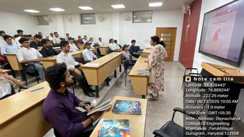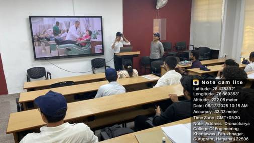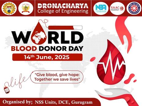 NSS Units of Dronacharya College of Engineering, Gurugram, organized a significant event on 14th June 2025 to mark World Blood Donor Day. Program was conducted by Dr. Anupam Dalal NSS Program Officer, The Program revolved around the theme “Give blood, give hope: Together we save lives,” aiming to raise awareness about the critical importance of blood donation.