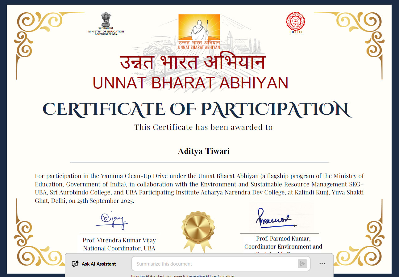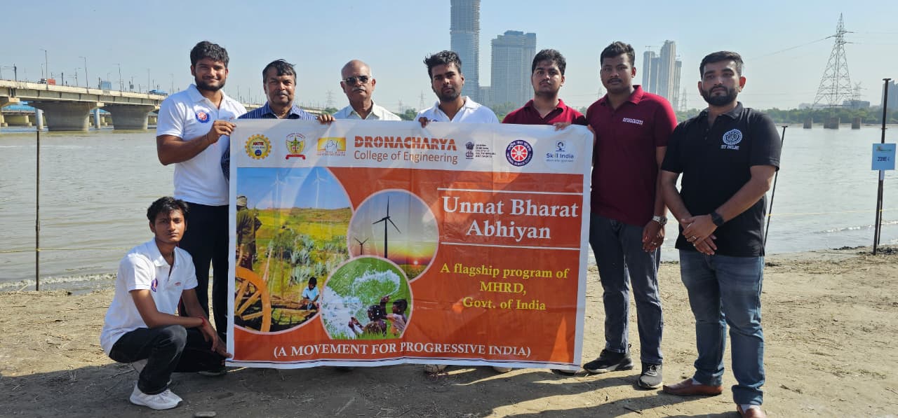 NSS Units, Dronacharya College of Engineering, Gurugram in collaboration with Sri Aurobindo College & Acharya Narendra Dev College, actively participated in the Yamuna Clean-Up Drive 2025 under the Unnat Bharat Abhiyan initiative held at KalindiKunj Ghat, Delhi, the event raised awareness about river conservation and environmental responsibility. Students engaged in sessions, performances, and the cleanliness drive, demonstrating teamwork, community service, and a commitment to sustainable practices while understanding the importance of collective efforts for ecological preservation.
