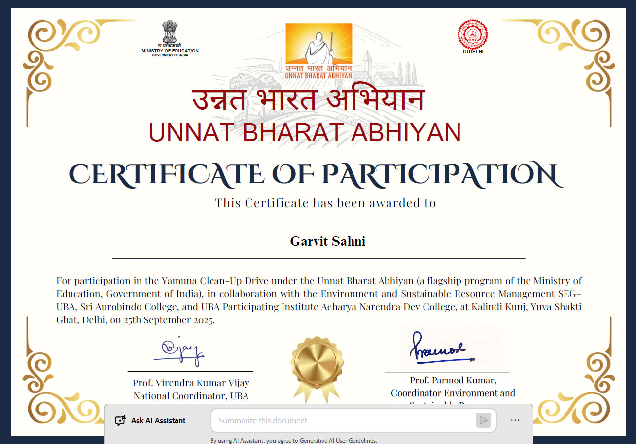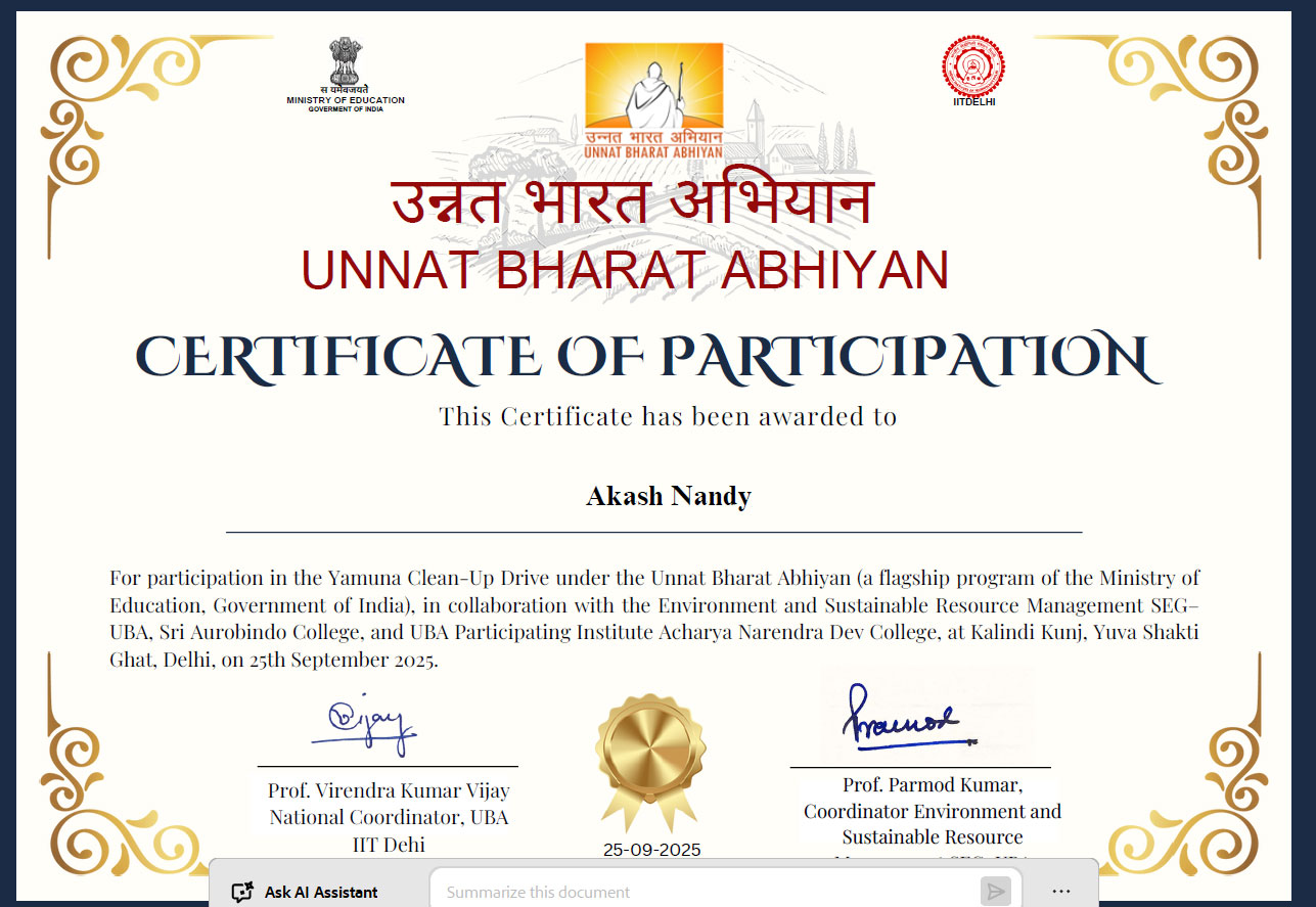 In conclusion, the Yamuna Clean-Up Drive 2025 provided students with a hands-on experience in environmental conservation, reinforcing the significance of collective action in tackling ecological challenges. The college extends sincere gratitude to the UBA team, and all volunteers for their support, guidance, and motivation. The drive not only enhanced students’ understanding of sustainability but also inspired them to uphold the principles of environmental protection and responsible living in their future endeavors, leaving a lasting impression on all participants.
