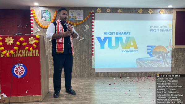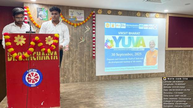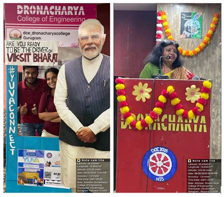 As part of the nationwide campaign Viksit Bharat Yuva Connect – Seva Pakhwada (17th September – 2nd October 2025) initiated by the Ministry of Youth Affairs & Sports, Government of India, the NSS Units of Dronacharya College of Engineering (DCE), Gurugram organized a highly impactful Yuva Connect Programme on 30th September 2025 at the college campus. The programme was designed to inspire students to contribute actively to nation-building by engaging them in thought-provoking discussions with policymakers, youth icons, and inspirational leaders. It aimed to nurture qualities of leadership, civic duty, and the spirit of service in young minds, aligning them with the vision of Viksit Bharat@2047.