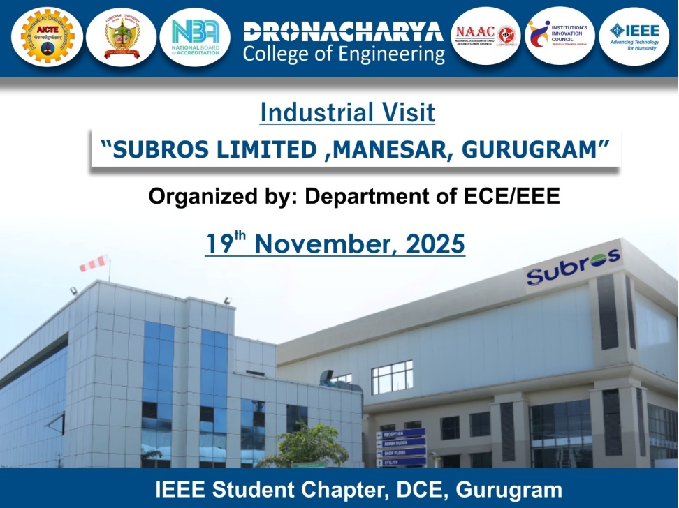 Departments of ECE and EEE at Dronacharya College of Engineering organized an industrial visit to Subros Ltd., Manesar on 19th November 2025 for their students coordinated by Ms Kanika Lamba (Faculty Coordinator). Subros Ltd. is one of India’s leading manufacturers of automotive air-conditioning systems, supplying components to major OEMs such as Maruti Suzuki, several other automobile companies, and the Indian Railways. The visit was aimed at providing students with practical exposure to industrial operations and an in-depth understanding of automotive AC technology.