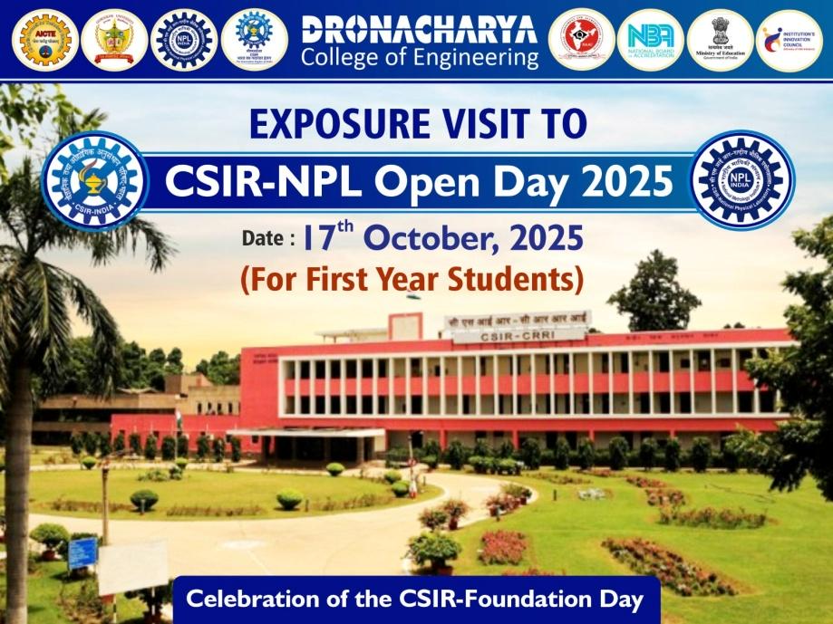 Dronacharya College of Engineering, Gurugram organized an educational exposure visit to the Council of Scientific and Industrial Research – National Physical Laboratory (CSIR–NPL), New Delhi, on 17th October 2025 for first-year students of the Computer Science and Engineering Department. The visit, coordinated by Prof. Neha Raghav, was held on the occasion of CSIR–NPL Open Day, an annual event that provides students an opportunity to witness the institute’s scientific achievements, advanced research facilities, and real-world applications of technology.
