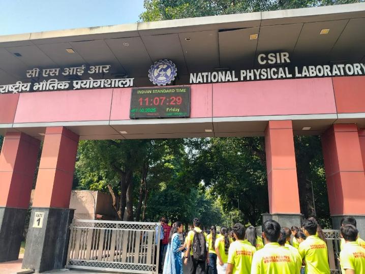 On arrival, students were welcomed by the NPL staff and given an introduction to the institute’s legacy, major research areas, and its pivotal role as India’s National Metrology Institute. NPL maintains national standards for measurement, ensuring accuracy and reliability across scientific and industrial sectors. The introductory session included a documentary showcasing NPL’s contributions to defense, space research, electronics, and other high-precision scientific domains.