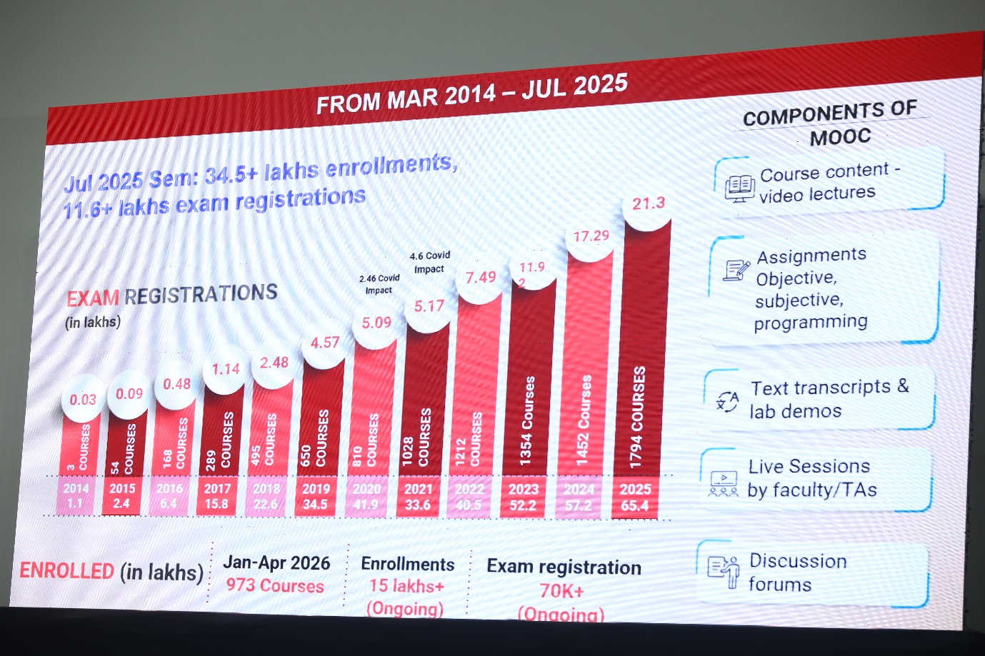 A detailed presentation by Prof. Dr. Satyaki Roy showcased recent developments and new initiatives on the NPTEL platform. These included the introduction of domain-specific courses in Sports Science, a new internship scheme for NPTEL course toppers at IITs under respective course coordinators, the success of the GATE portal providing free preparation resources, the launch of self-paced courses through NPTEL+, and comprehensive semester-wise analytical performance reports.